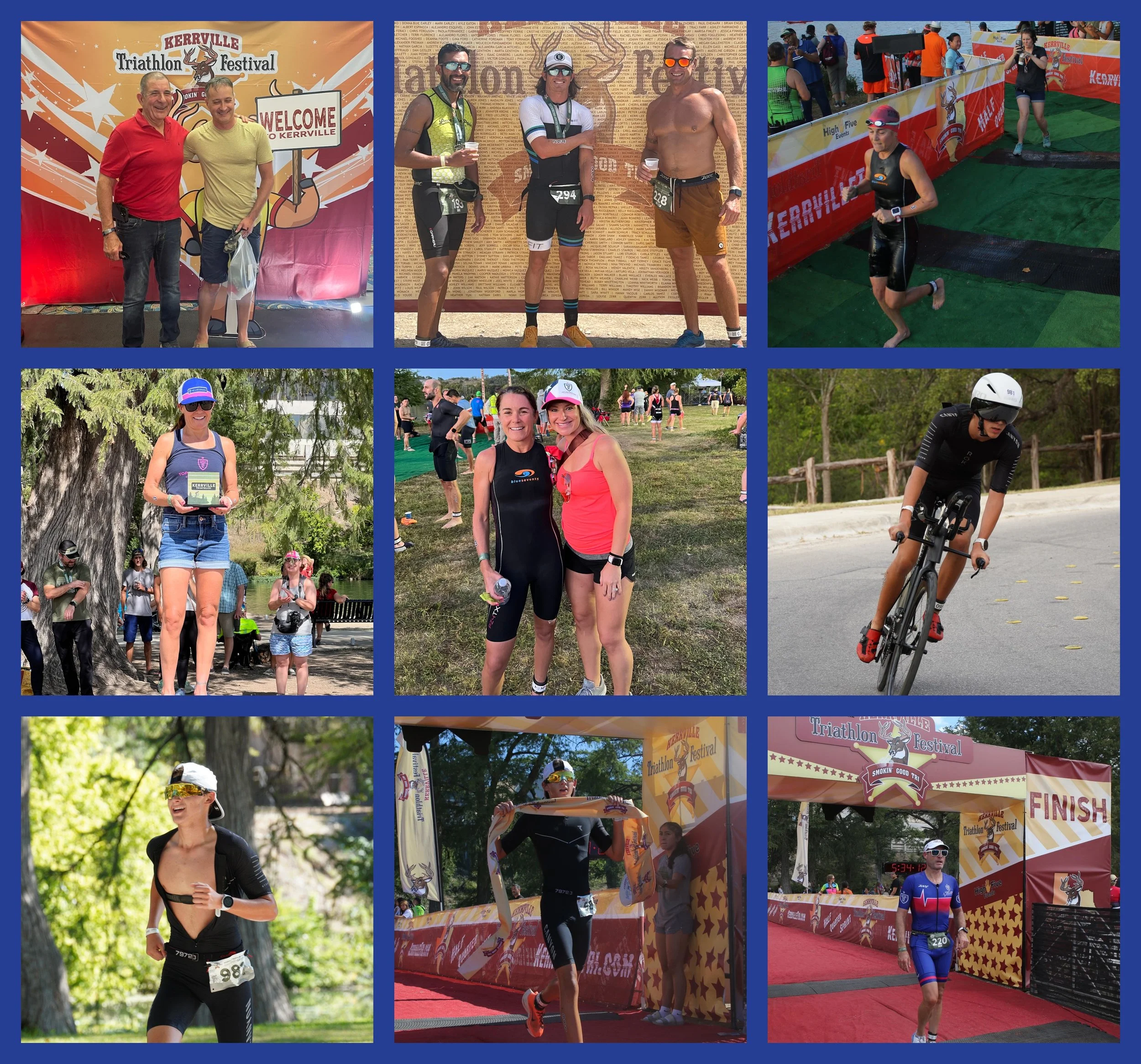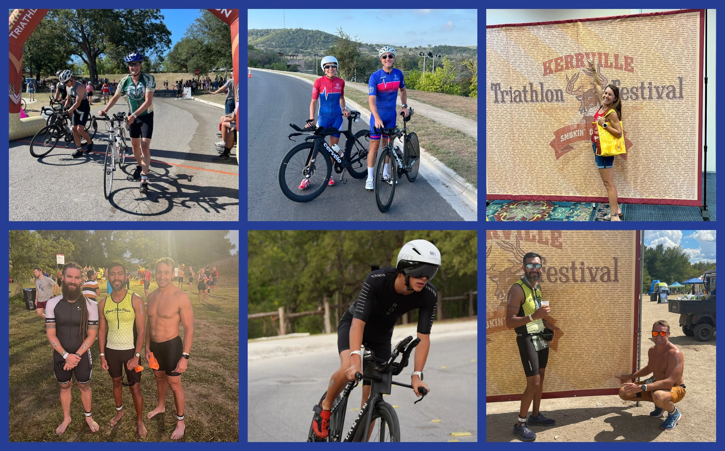 Pictured bottom: Coach Nik enjoys the stunning hill country bike course and fights for a steady run with temperatures in the 90's!