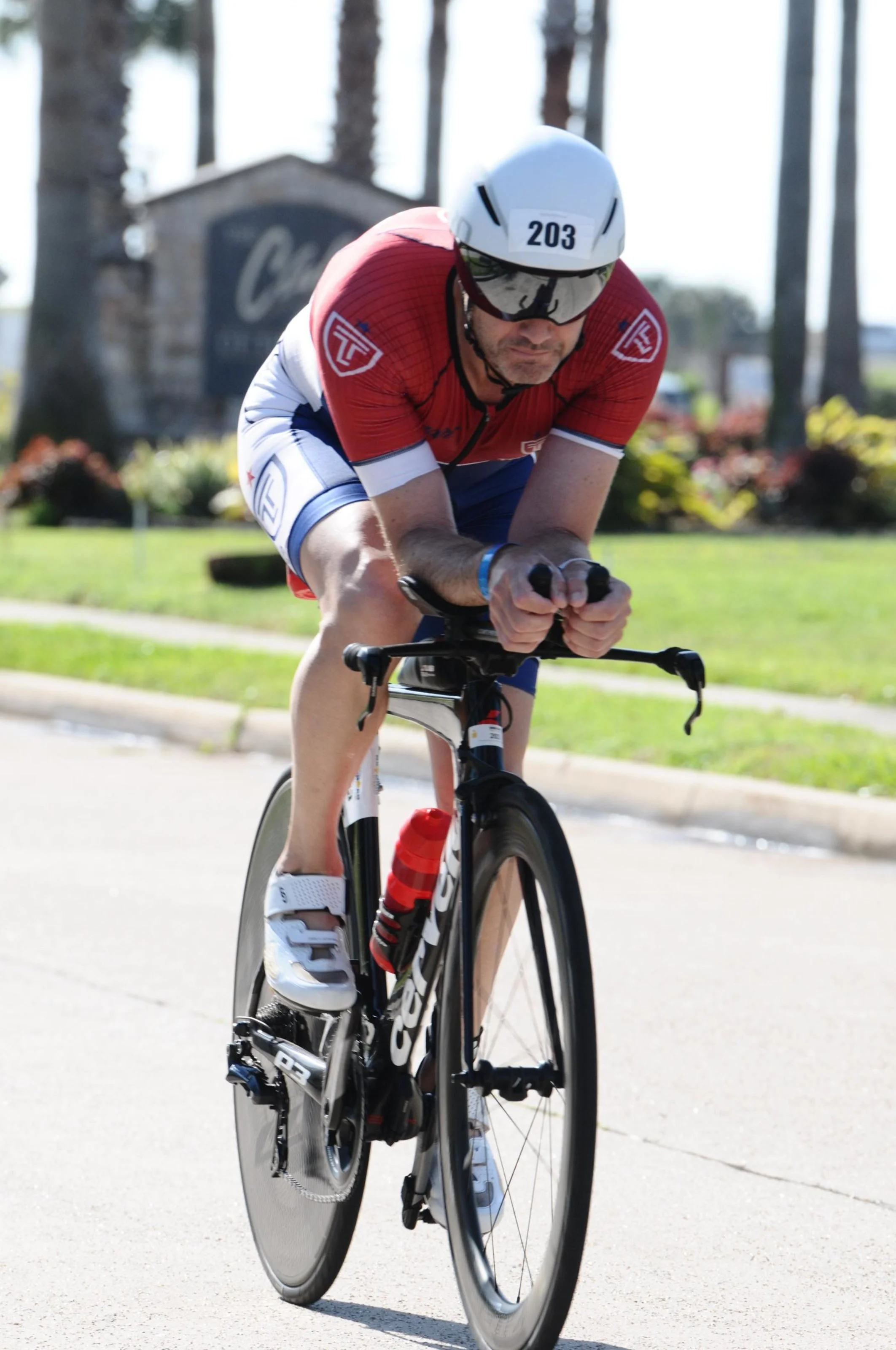 After exiting the swim, we were greeted by hundreds of cheering spectators, making the jog through transition a real thrill! The Galveston bike course is known for smooth, flat roads and a tail wind on the way out to the furthest point on the course. The return trip is where mental toughness and race plan execution really matter. Pictured below is Top Line athlete Brent Aucutt riding a strong and balanced race and capitalizing on his cycling strength.